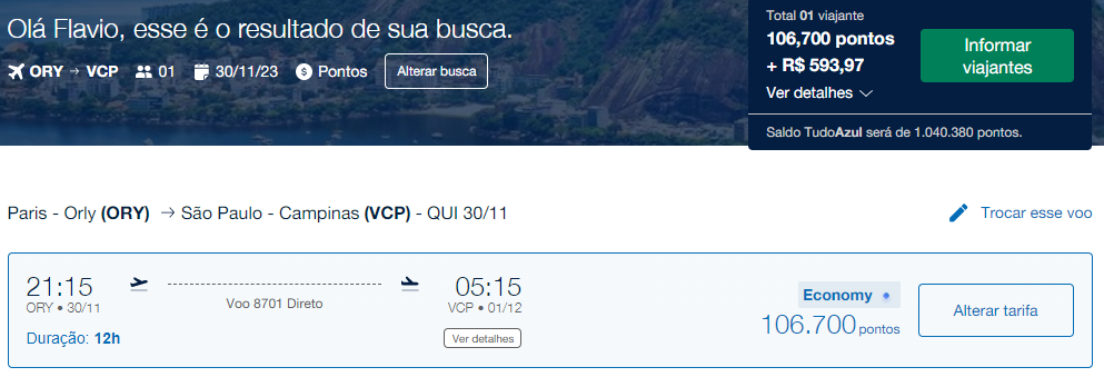 Voo direto da Azul, saindo de ORY para VCP por 106.700 pontos e 593,97 reais de taxa. Valor estimado em 2.301,17 (106,7 * 16 + 593,97) reais. Esse voo pode fazer mais sentido a opção pagante se você aproveitar o desconto de 10% com os cartões da AZUL.