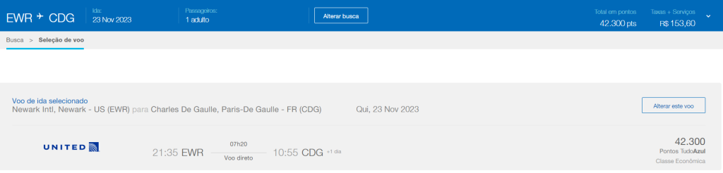 Para essa emissão precisamos de 62.100 milhas + 137,85 reais de taxas para o trecho GRU para EWR e 42.300 milhas + 153,60 reais de taxas para o trecho de EWR para CDG.