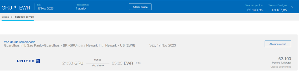O primeiro trecho é de GRU para EWR, por apenas 62.100 milhas azul e 137,85 reais de taxa. Lembrando que é relativamente fácil conseguir o milheiro azul em torno de 16 e 17,50 reais. É um voo direto e na econômica, está incluso no valor uma mala despachada – o que é muito bom. Esse é um trecho que possui muita disponibilidade. No exemplo o voo seria feito no dia 17 de novembro.