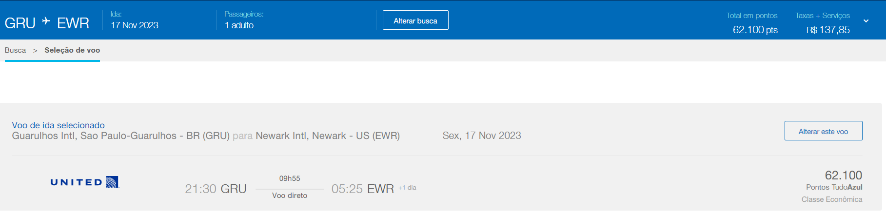 O primeiro trecho é de GRU para EWR, por apenas 62.100 milhas azul e 137,85 reais de taxa. Lembrando que é relativamente fácil conseguir o milheiro azul em torno de 16 e 17,50 reais. É um voo direto e na econômica, está incluso no valor uma mala despachada – o que é muito bom. Esse é um trecho que possui muita disponibilidade. No exemplo o voo seria feito no dia 17 de novembro.