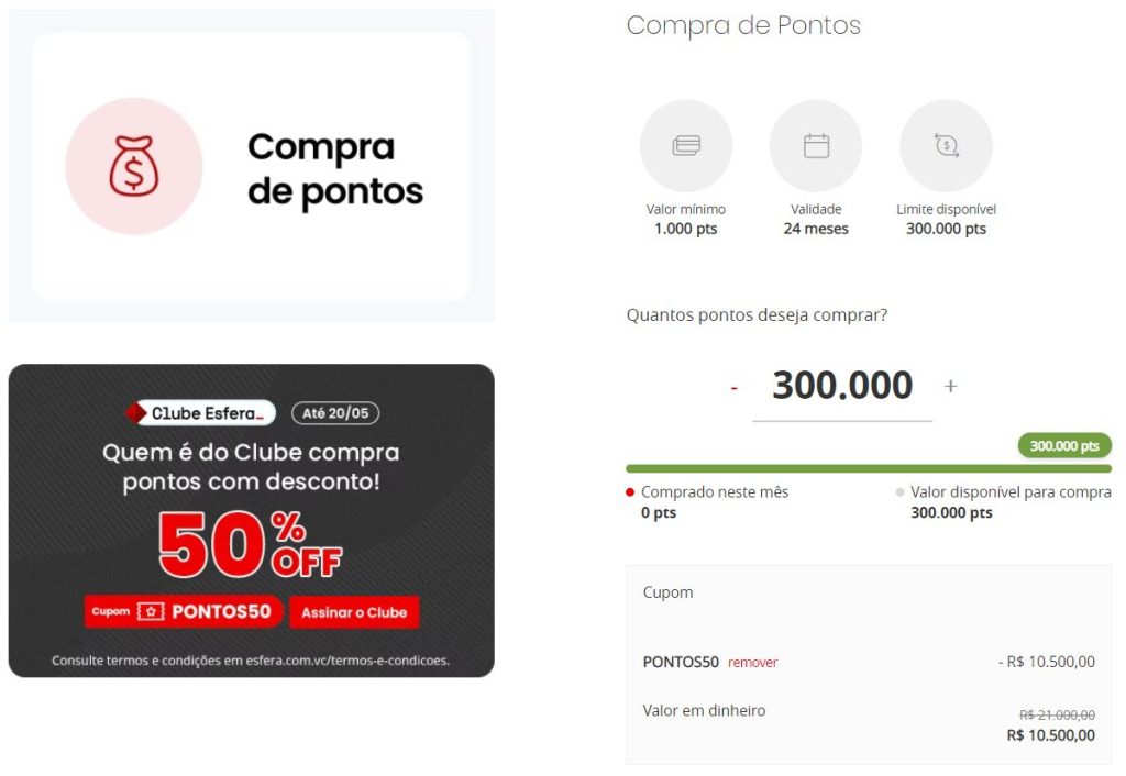 Para os assinantes do clube, é permitido comprar até 300.000 pontos. Os pontos são válidos por 24 meses.