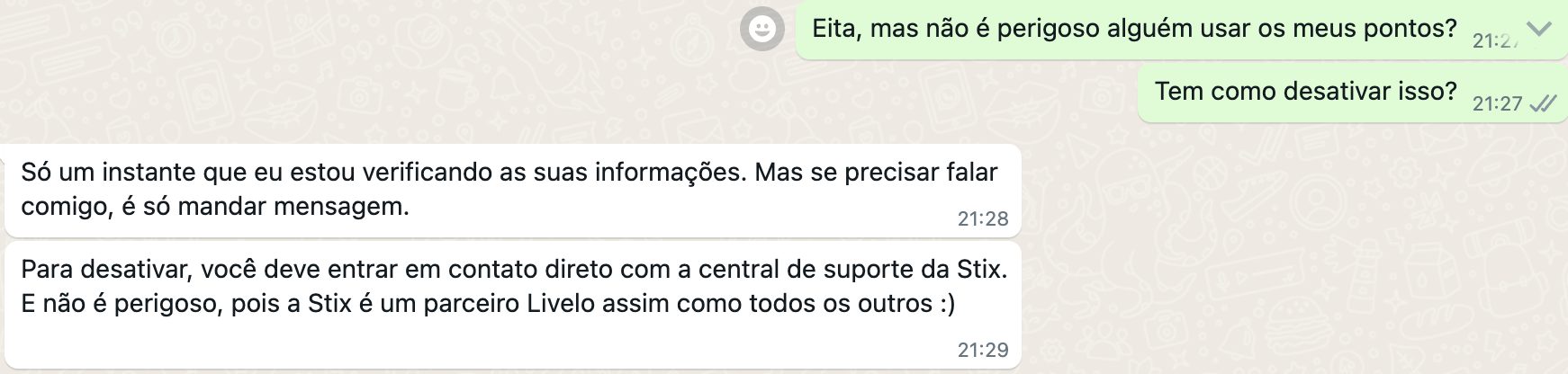Entrei em contato com a Livelo pelo whatsapp e me surpreendi, para falar com o atendente eu tive que confirmar um SMS, mas para fazer a troca dos seus pontos em um parceiro não é necessário. Pior, não tem como desativar isso, ou seja, os seus pontos podem ser roubados e não há nada que você possa fazer para evitar isso.