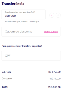Vamos ao exemplo, ao transferir 150k de pontos, a outra pessoa irá receber os 150k + 90k (que são os 60% de bônus), totalizando 240k de milhas.