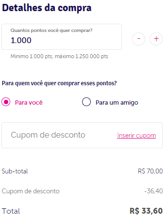 A campanha consiste em comprar pontos para você. O desconto é fixo em 52% de desconto e a quantidade máxima de pontos permitido para compra depende do clube que você assina.