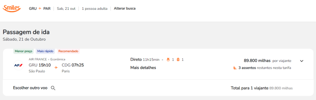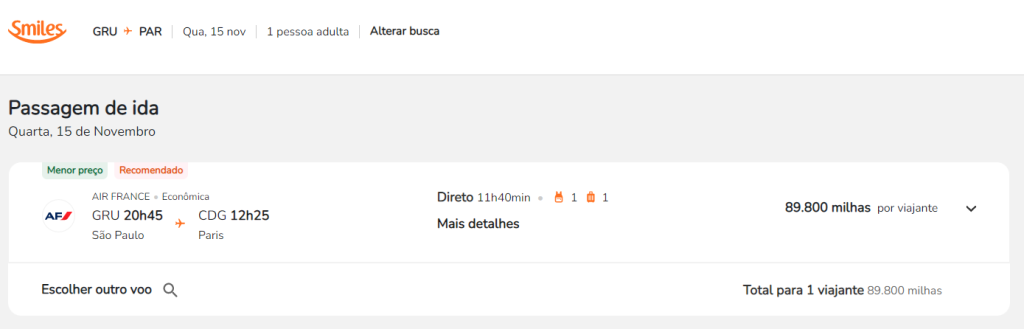 É possível emitir esse trecho por apenas 89.800 milhas smiles e 52,44 reais de taxa. Recentemente tivemos promoções de compra e transferência de pontos, que permitem que o custo do milheiro fique entre 14 e 17,50 reais.