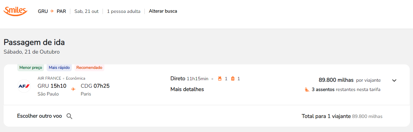 É possível emitir esse trecho por apenas 89.800 milhas smiles e 52,44 reais de taxa. Recentemente tivemos promoções de compra e transferência de pontos, que permitem que o custo do milheiro fique entre 14 e 17,50 reais.