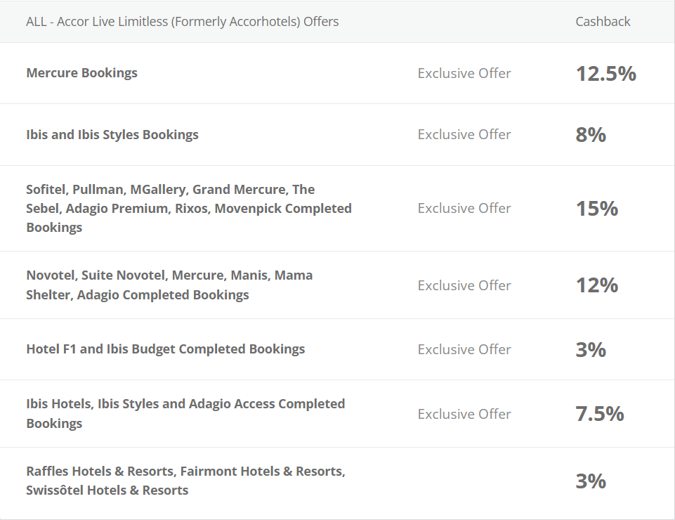 O percentual do cashback depende do hotel que você irá realizar a reserva, confira na imagem abaixo o percentual de cada um.
